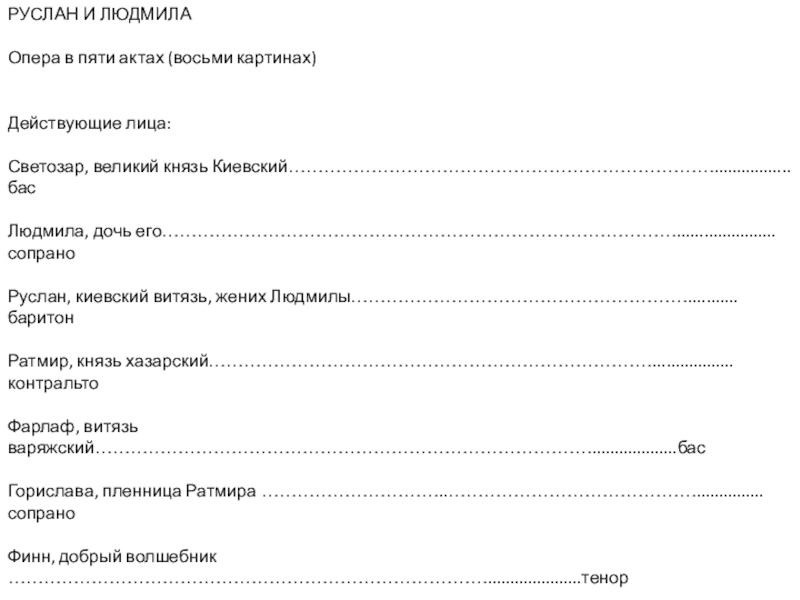Руслан, киевский витязь, жених Людмилы…………………………………………………........... баритон