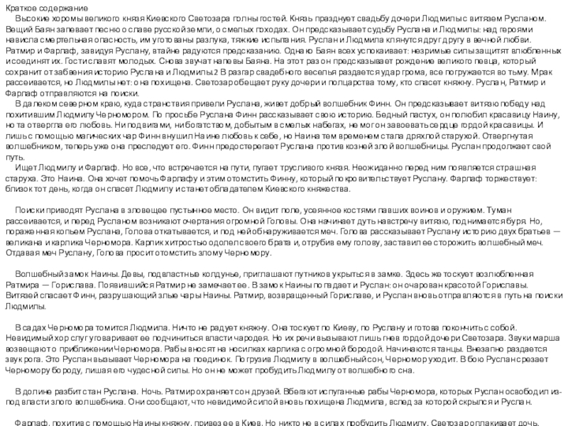 гостей. Князь празднует свадьбу дочери Людмилы с витязем Русланом. Вещий Баян запевает песню о славе русской земли, о смелых походах. Он предсказывает судьбу Руслана и Людмилы: над героями нависла смертельная опасность, им уготованы разлука, тяжкие испытания. Руслан и Людмила клянутся друг другу в вечной любви. Ратмир и Фарлаф, завидуя Руслану, втайне радуются предсказанию. Однако Баян всех успокаивает: незримые силы защитят влюбленных и соединят их. Гости славят молодых. Снова звучат напевы Баяна. На этот раз он предсказывает рождение великого певца, который сохранит от забвения историю Руслана и Людмилы.2 В разгар свадебного веселья раздается удар грома, все погружается во тьму. Мрак рассеивается, но Людмилы нет: она похищена. Светозар обещает руку дочери и полцарства тому, кто спасет княжну. Руслан, Ратмир и Фарлаф отправляются на поиски.