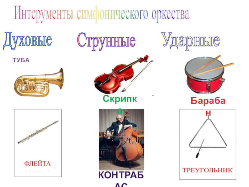 Интсрументы симфонического оркества ДуховыеСтрунныеУдарныеСкрипкаКонтрАбасБарабан