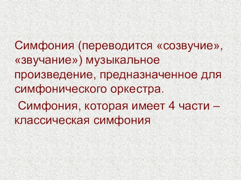 Симфония (переводится «созвучие», «звучание») музыкальное произведение, предназначенное для симфонического оркестра. Симфония, которая имеет 4 части – классическая симфония