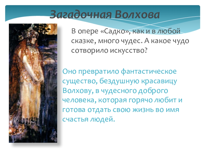 Оно превратило фантастическое существо, бездушную красавицу Волхову, в чудесного доброго человека, которая горячо любит и готова отдать свою жизнь во имя счастья людей.
