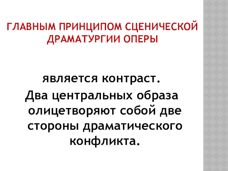Главным принципом сценической драматургии оперыявляется контраст.Два центральных образа олицетворяют собой две стороны драматического конфликта.