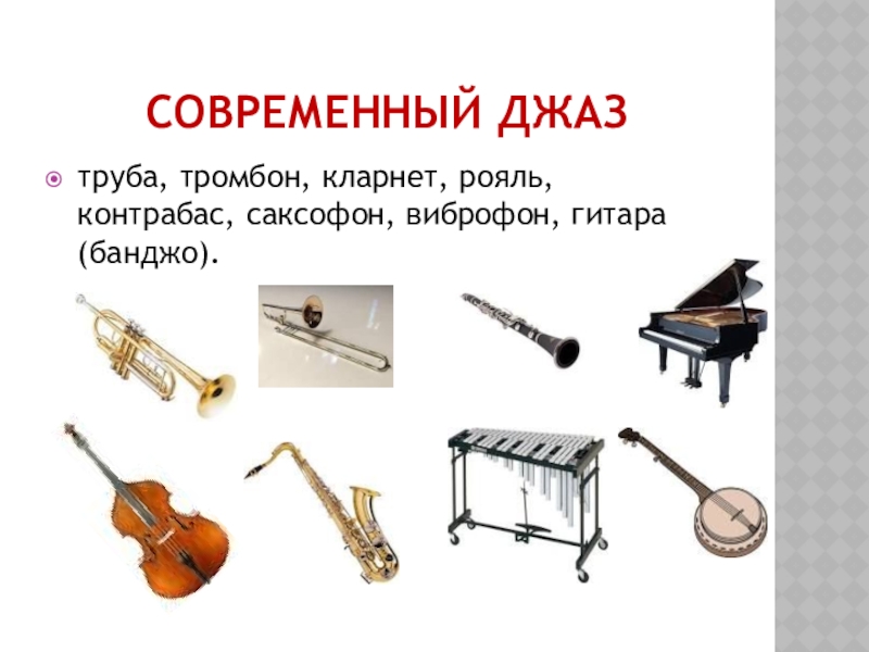 Современный джаз труба, тромбон, кларнет, рояль, контрабас, саксофон, виброфон, гитара (банджо).