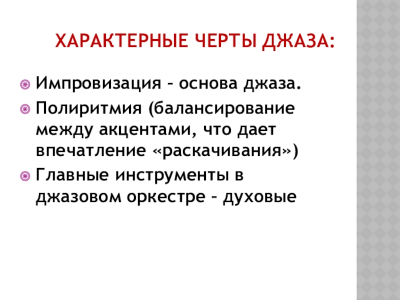Характерные черты джаза:   Импровизация – основа джаза.Полиритмия (балансирование между акцентами, что дает впечатление «раскачивания»)Главные инструменты