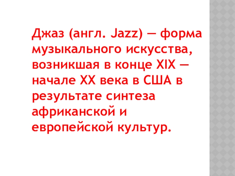 Слайд 4Джаз (англ. Jazz) — форма музыкального искусства, возникшая в конце XIX