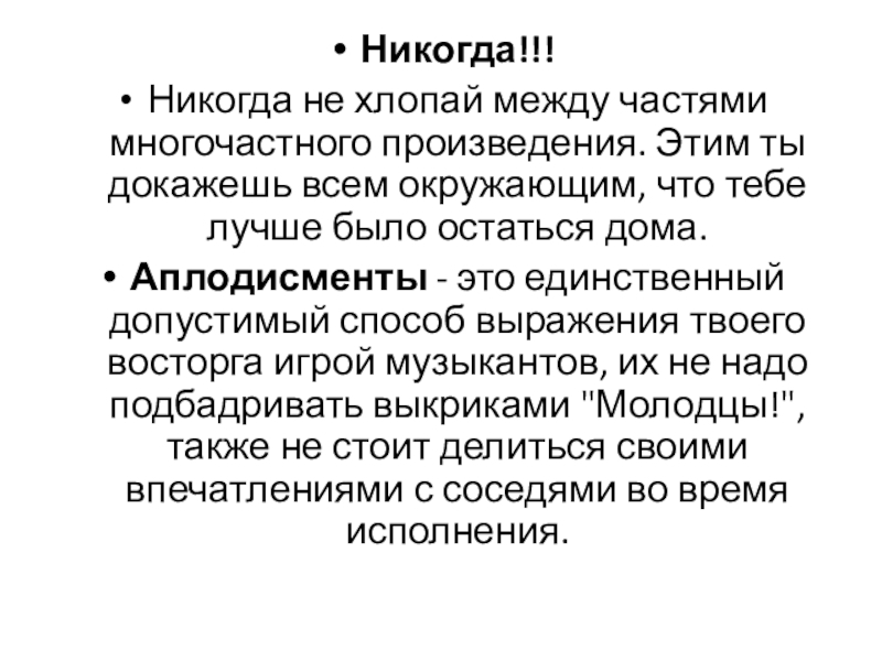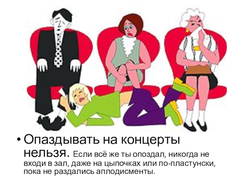 Слайд 4Опаздывать на концерты нельзя. Если всё же ты опоздал, никогда не