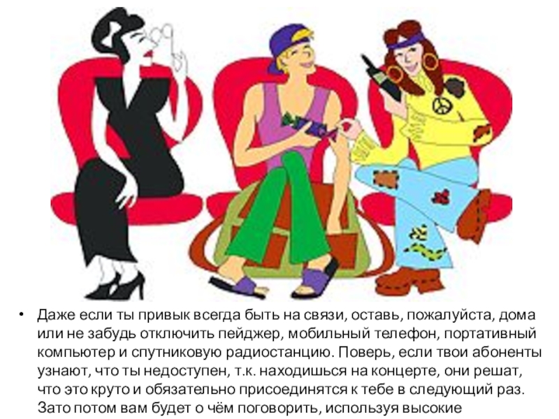 или не забудь отключить пейджер, мобильный телефон, портативный компьютер и спутниковую радиостанцию. Поверь, если твои абоненты узнают, что ты недоступен, т.к. находишься на концерте, они решат, что это круто и обязательно присоединятся к тебе в следующий раз. Зато потом вам будет о чём поговорить, используя высокие технологии.