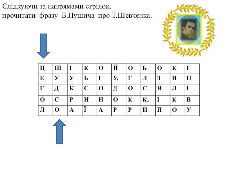 Слідкуючи за напрямами стрілок, прочитати фразу Б.Нушича про Т.Шевченка.