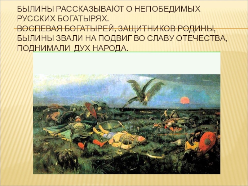 Слайд 15БЫЛИНЫ РАССКАЗЫВАЮТ О НЕПОБЕДИМЫХ РУССКИХ БОГАТЫРЯХ.