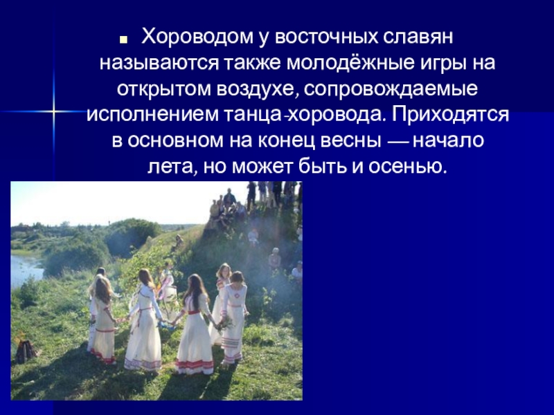 Слайд 7Хороводом у восточных славян называются также молодёжные игры на открытом воздухе,