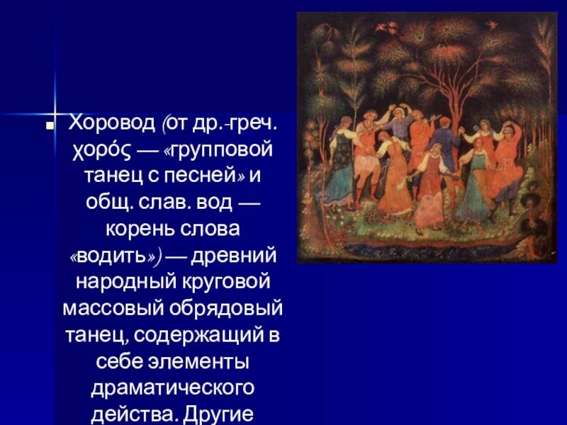 Слайд 2Хоровод (от др.-греч. χορός — «групповой танец с песней» и общ.