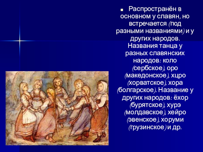 у других народов. Названия танца у разных славянских народов: коло (сербское), оро (македонское), хцро (хорватское), хора (болгарское). Название у других народов: ёхор (бурятское), хурэ (молдавское), хейро (эвенское), хоруми (грузинское) и др.