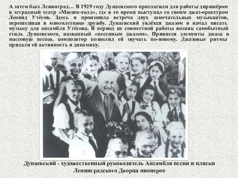 Слайд 6Дунаевский - художественный руководитель Ансамбля песни и пляски Ленинградского Дворца пионеров