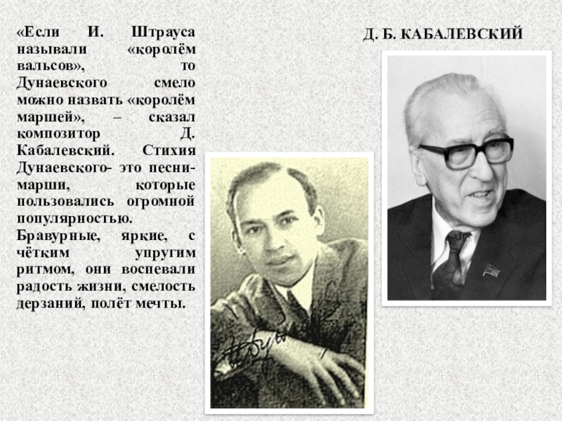 можно назвать «королём маршей», – сказал композитор Д. Кабалевский. Стихия Дунаевского- это песни-марши, которые пользовались огромной популярностью. Бравурные, яркие, с чётким упругим ритмом, они воспевали радость жизни, смелость дерзаний, полёт мечты.