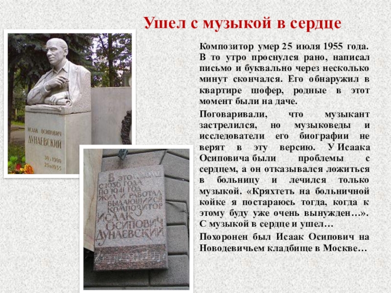 Поговаривали, что музыкант застрелился, но музыковеды и исследователи его биографии не верят в эту версию. У Исаака Осиповича были проблемы с сердцем, а он отказывался ложиться в больницу и лечился только музыкой. «Кряхтеть на больничной койке я постараюсь тогда, когда к этому буду уже очень вынужден…». С музыкой в сердце и ушел…