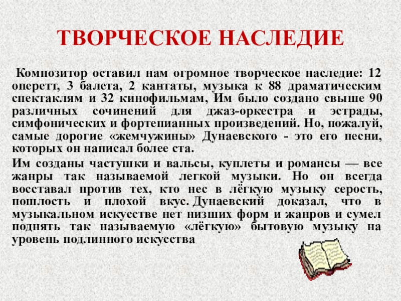 балета, 2 кантаты, музыка к 88 драматическим спектаклям и 32 кинофильмам, Им было создано свыше 90 различных сочинений для джаз-оркестра и эстрады, симфонических и фортепианных произведений. Но, пожалуй, самые дорогие «жемчужины» Дунаевского - это его песни, которых он написал более ста.