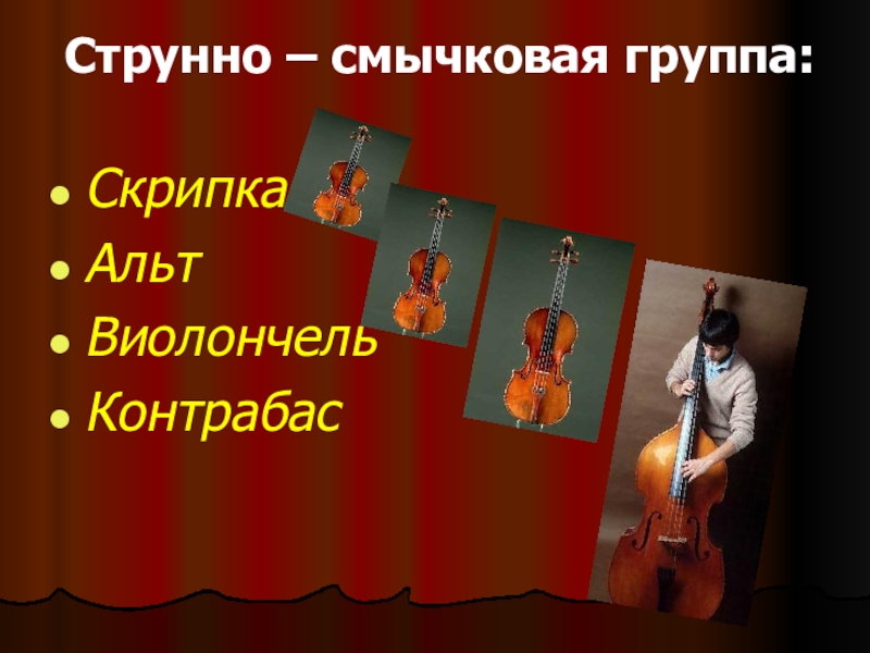 Струнно – смычковая группа:СкрипкаАльтВиолончельКонтрабас