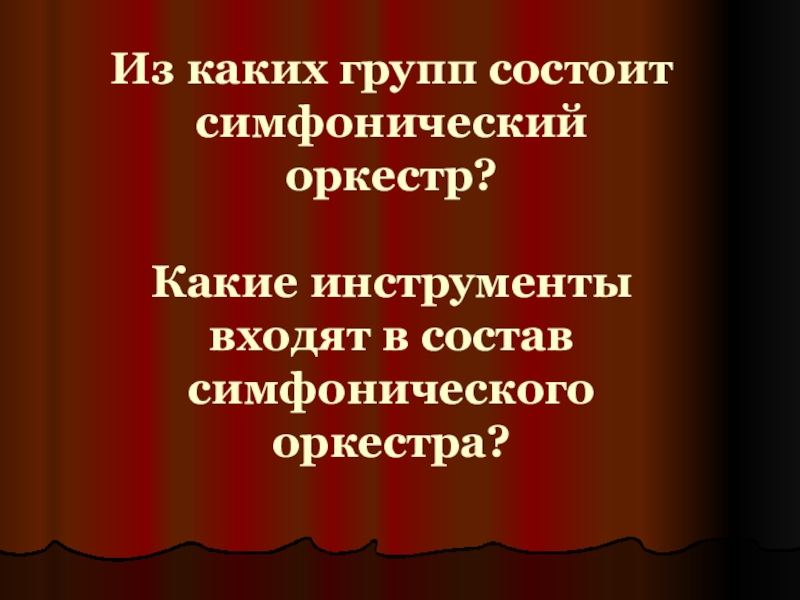 Слайд 16Из каких групп состоит симфонический оркестр? Какие инструменты входят в состав симфонического