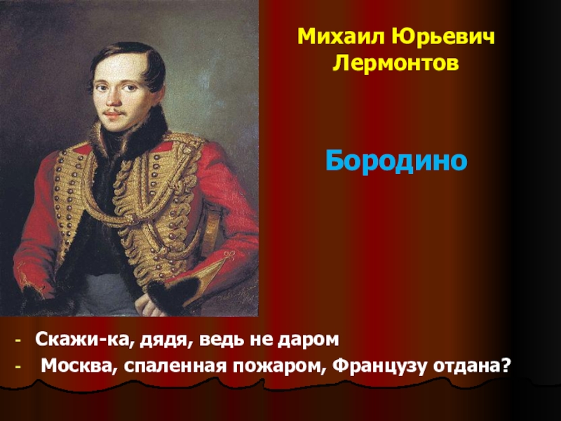 Михаил Юрьевич Лермонтов   Бородино Скажи-ка, дядя, ведь не даром Москва, спаленная пожаром, Французу отдана?