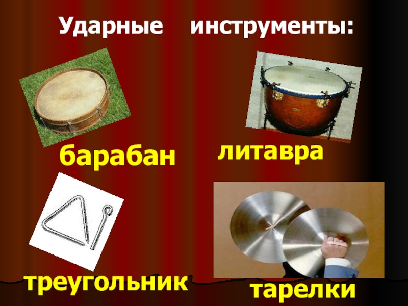 Ударные  инструменты:барабанлитавратреугольниктарелки