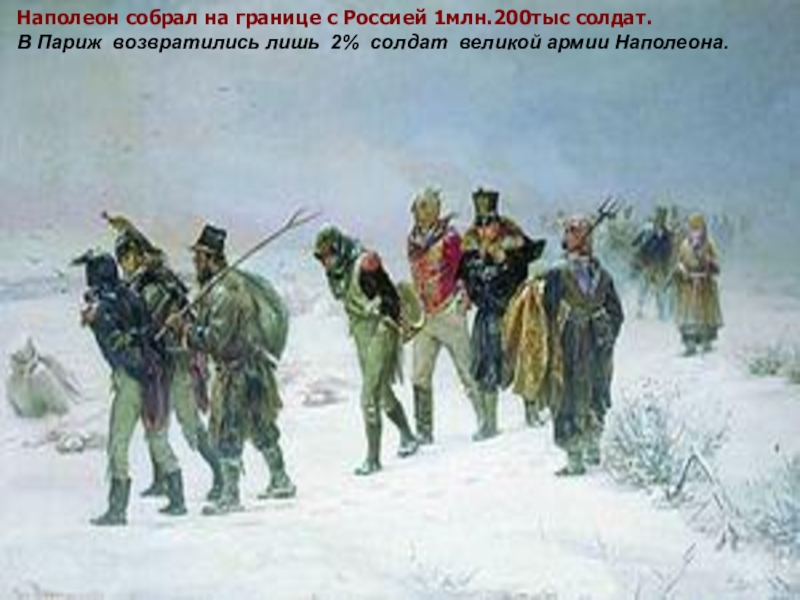 Наполеон собрал на границе с Россией 1млн.200тыс солдат. В Париж возвратились лишь 2% солдат великой армии Наполеона.