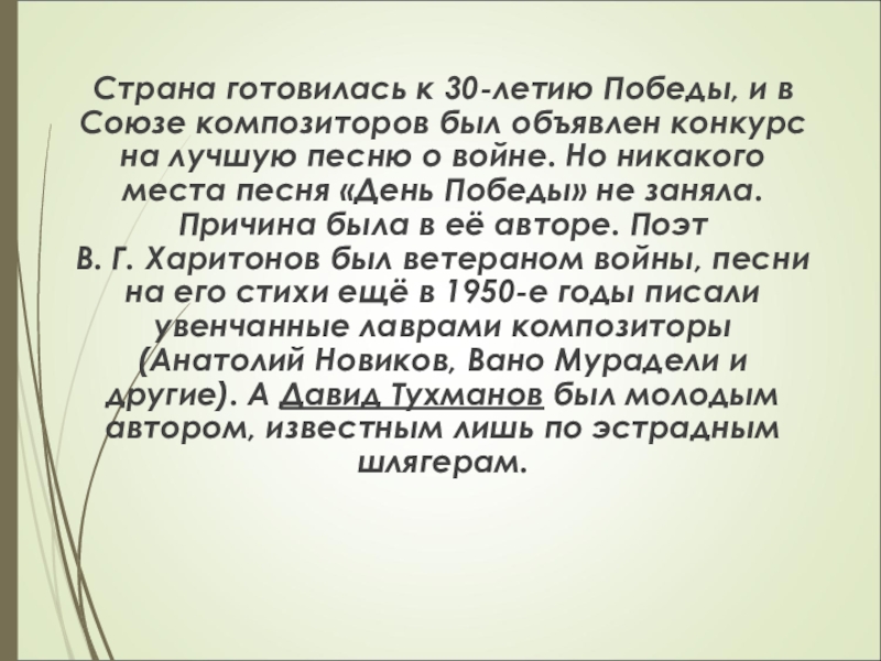 Слайд 39 Страна готовилась к 30-летию Победы, и в Союзе композиторов