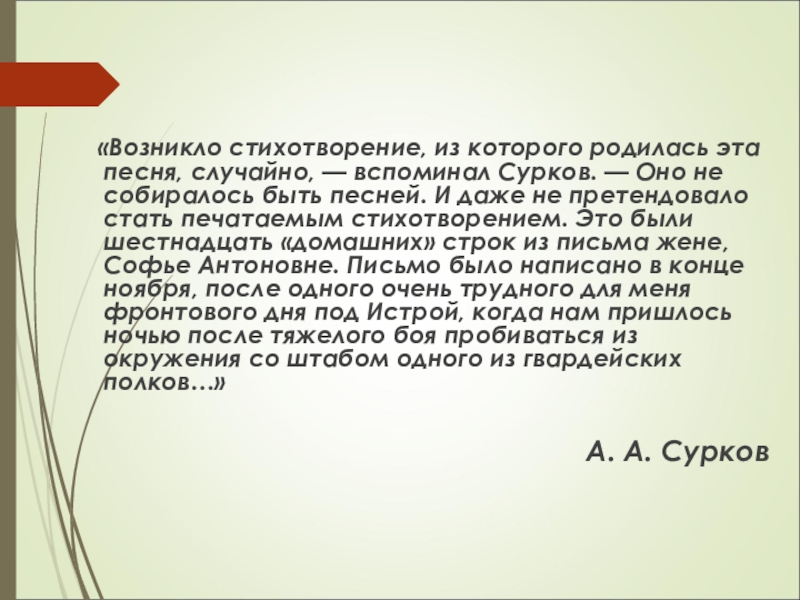 вспоминал Сурков. — Оно не собиралось быть песней. И даже не претендовало стать печатаемым стихотворением. Это были шестнадцать «домашних» строк из письма жене, Софье Антоновне. Письмо было написано в конце ноября, после одного очень трудного для меня фронтового дня под Истрой, когда нам пришлось ночью после тяжелого боя пробиваться из окружения со штабом одного из гвардейских полков…»