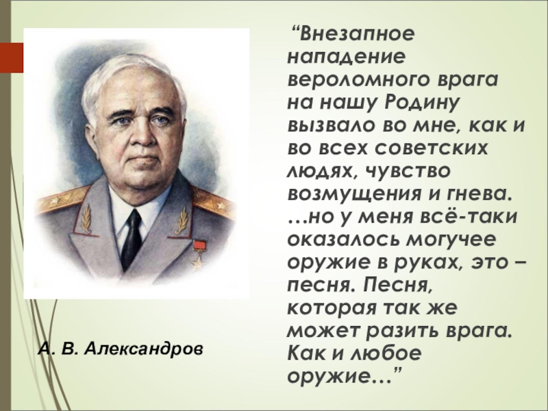 мне, как и во всех советских людях, чувство возмущения и гнева. …но у меня всё-таки оказалось могучее оружие в руках, это – песня. Песня, которая так же может разить врага. Как и любое оружие…”