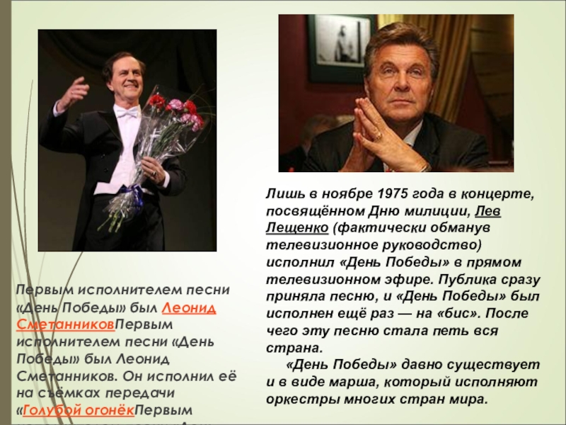 песни «День Победы» был Леонид Сметанников. Он исполнил её на съёмках передачи «Голубой огонёкПервым исполнителем песни «День Победы» был Леонид Сметанников. Он исполнил её на съёмках передачи «Голубой огонёк» в канун 9 маяПервым исполнителем песни «День Победы» был Леонид Сметанников. Он исполнил её на съёмках передачи «Голубой огонёк» в канун 9 мая 1975 года.
