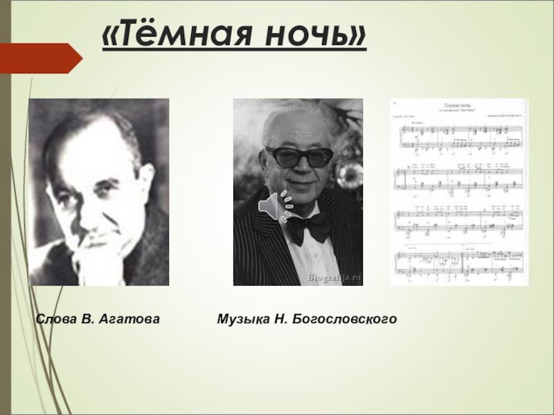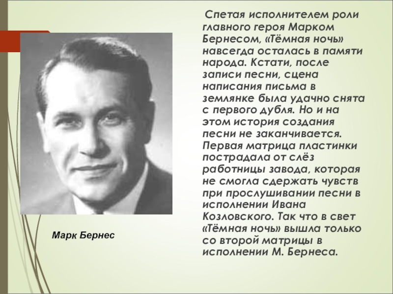 Слайд 26 Спетая исполнителем роли главного героя Марком Бернесом, «Тёмная ночь»