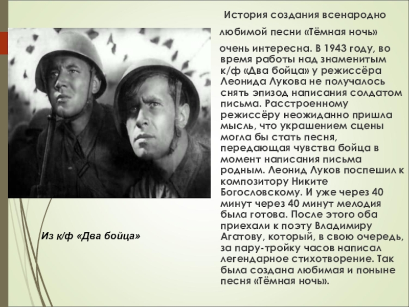 очень интересна. В 1943 году, во время работы над знаменитым к/ф «Два бойца» у режиссёра Леонида Лукова не получалось снять эпизод написания солдатом письма. Расстроенному режиссёру неожиданно пришла мысль, что украшением сцены могла бы стать песня, передающая чувства бойца в момент написания письма родным. Леонид Луков поспешил к композитору Никите Богословскому. И уже через 40 минут через 40 минут мелодия была готова. После этого оба приехали к поэту Владимиру Агатову, который, в свою очередь, за пару-тройку часов написал легендарное стихотворение. Так была создана любимая и поныне песня «Тёмная ночь».