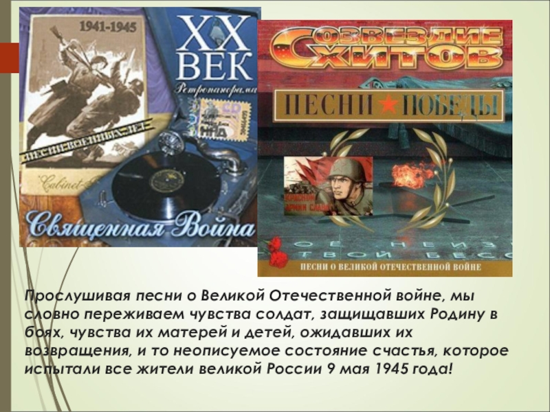 Слайд 44Прослушивая песни о Великой Отечественной войне, мы словно переживаем чувства солдат,