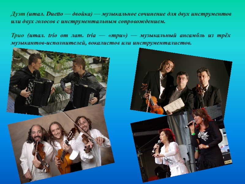 Трио (итал. trio от лат. tria — «три») — музыкальный ансамбль из трёх музыкантов-исполнителей, вокалистов или инструменталистов.
