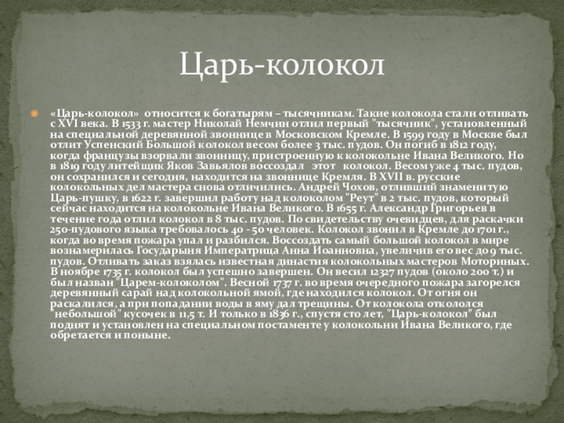 XVI века. В 1533 г. мастер Николай Немчин отлил первый "тысячник", установленный на специальной деревянной звоннице в Московском Кремле. В 1599 году в Москве был отлит Успенский Большой колокол весом более 3 тыс. пудов. Он погиб в 1812 году, когда французы взорвали звонницу, пристроенную к колокольне Ивана Великого. Но в 1819 году литейщик Яков Завьялов воссоздал этот колокол. Весом уже 4 тыс. пудов, он сохранился и сегодня, находится на звоннице Кремля. В XVII в. русские колокольных дел мастера снова отличились. Андрей Чохов, отливший знаменитую Царь-пушку, в 1622 г. завершил работу над колоколом "Реут" в 2 тыс. пудов, который сейчас находится на колокольне Ивана Великого. В 1655 г. Александр Григорьев в течение года отлил колокол в 8 тыс. пудов. По свидетельству очевидцев, для раскачки 250-пудового языка требовалось 40 - 50 человек. Колокол звонил в Кремле до 1701 г., когда во время пожара упал и разбился. Воссоздать самый большой колокол в мире вознамерилась Государыня Императрица Анна Иоанновна, увеличив его вес до 9 тыс. пудов. Отливать заказ взялась известная династия колокольных мастеров Моториных. В ноябре 1735 г. колокол был успешно завершен. Он весил 12327 пудов (около 200 т.) и был назван "Царем-колоколом". Весной 1737 г. во время очередного пожара загорелся деревянный сарай над колокольной ямой, где находился колокол. От огня он раскалился, а при попадании воды в яму дал трещины. От колокола откололся "небольшой" кусочек в 11,5 т. И только в 1836 г., спустя сто лет, "Царь-колокол” был поднят и установлен на специальном постаменте у колокольни Ивана Великого, где обретается и поныне.