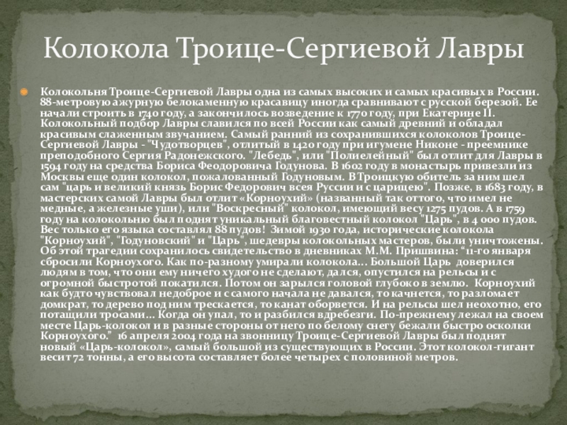 красивых в России. 88-метровую ажурную белокаменную красавицу иногда сравнивают с русской березой. Ее начали строить в 1740 году, а закончилось возведение к 1770 году, при Екатерине II. Колокольный подбор Лавры славился по всей России как самый древний и обладал красивым слаженным звучанием. Самый ранний из сохранившихся колоколов Троице-Сергиевой Лавры - "Чудотворцев", отлитый в 1420 году при игумене Никоне - преемнике преподобного Сергия Радонежского. "Лебедь", или "Полиелейный" был отлит для Лавры в 1594 году на средства Бориса Феодоровича Годунова. В 1602 году в монастырь привезли из Москвы еще один колокол, пожалованный Годуновым. В Троицкую обитель за ним шел сам "царь и великий князь Борис Федорович всея Руссии и с царицею". Позже, в 1683 году, в мастерских самой Лавры был отлит «Корноухий» (названный так оттого, что имел не медные, а железные уши), или "Воскресный" колокол, имеющий весу 1275 пудов. А в 1759 году на колокольню был поднят уникальный благовестный колокол "Царь", в 4 000 пудов. Вес только его языка составлял 88 пудов! Зимой 1930 года, исторические колокола "Корноухий", "Годуновский" и "Царь", шедевры колокольных мастеров, были уничтожены. Об этой трагедии сохранилось свидетельство в дневниках М.М. Пришвина: “11-го января сбросили Корноухого. Как по-разному умирали колокола... Большой Царь доверился людям в том, что они ему ничего худого не сделают, дался, опустился на рельсы и с огромной быстротой покатился. Потом он зарылся головой глубоко в землю. Корноухий как будто чувствовал недоброе и с самого начала не давался, то качнется, то разломает домкрат, то дерево под ним трескается, то канат оборвется. И на рельсы шел неохотно, его потащили тросами... Когда он упал, то и разбился вдребезги. По-прежнему лежал на своем месте Царь-колокол и в разные стороны от него по белому снегу бежали быстро осколки Корноухого.” 16 апреля 2004 года на звонницу Троице-Сергиевой Лавры был поднят новый «Царь-колокол», самый большой из существующих в России. Этот колокол-гигант весит 72 тонны, а его высота составляет более четырех с половиной метров.