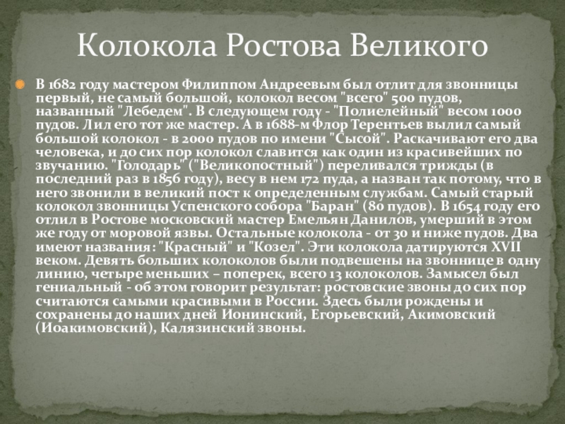 звонницы первый, не самый большой, колокол весом "всего" 500 пудов, названный "Лебедем". В следующем году - "Полиелейный" весом 1000 пудов. Лил его тот же мастер. А в 1688-м Флор Терентьев вылил самый большой колокол - в 2000 пудов по имени "Сысой". Раскачивают его два человека, и до сих пор колокол славится как один из красивейших по звучанию. "Голодарь" ("Великопостный") переливался трижды (в последний раз в 1856 году), весу в нем 172 пуда, а назван так потому, что в него звонили в великий пост к определенным службам. Самый старый колокол звонницы Успенского собора "Баран" (80 пудов). В 1654 году его отлил в Ростове московский мастер Емельян Данилов, умерший в этом же году от моровой язвы. Остальные колокола - от 30 и ниже пудов. Два имеют названия: "Красный" и "Козел". Эти колокола датируются XVII веком. Девять больших колоколов были подвешены на звоннице в одну линию, четыре меньших – поперек, всего 13 колоколов. Замысел был гениальный - об этом говорит результат: ростовские звоны до сих пор считаются самыми красивыми в России. Здесь были рождены и сохранены до наших дней Ионинский, Егорьевский, Акимовский (Иоакимовский), Калязинский звоны.