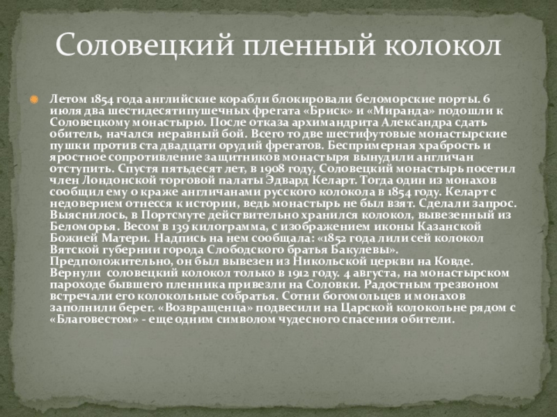 июля два шестидесятипушечных фрегата «Бриск» и «Миранда» подошли к Соловецкому монастырю. После отказа архимандрита Александра сдать обитель, начался неравный бой. Всего то две шестифутовые монастырские пушки против ста двадцати орудий фрегатов. Беспримерная храбрость и яростное сопротивление защитников монастыря вынудили англичан отступить. Спустя пятьдесят лет, в 1908 году, Соловецкий монастырь посетил член Лондонской торговой палаты Эдвард Келарт. Тогда один из монахов сообщил ему о краже англичанами русского колокола в 1854 году. Келарт с недоверием отнесся к истории, ведь монастырь не был взят. Сделали запрос. Выяснилось, в Портсмуте действительно хранился колокол, вывезенный из Беломорья. Весом в 139 килограмма, с изображением иконы Казанской Божией Матери. Надпись на нем сообщала: «1852 года лили сей колокол Вятской губернии города Слободского братья Бакулевы». Предположительно, он был вывезен из Никольской церкви на Ковде. Вернули соловецкий колокол только в 1912 году. 4 августа, на монастырском пароходе бывшего пленника привезли на Соловки. Радостным трезвоном встречали его колокольные собратья. Сотни богомольцев и монахов заполнили берег. «Возвращенца» подвесили на Царской колокольне рядом с «Благовестом» - еще одним символом чудесного спасения обители.