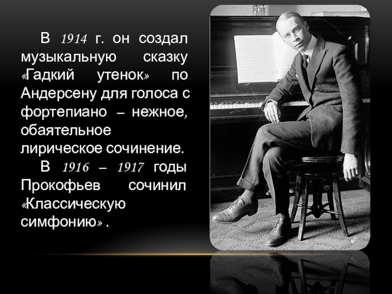 Слайд 8 В 1914 г. он создал музыкальную сказку «Гадкий утенок» по Андерсену