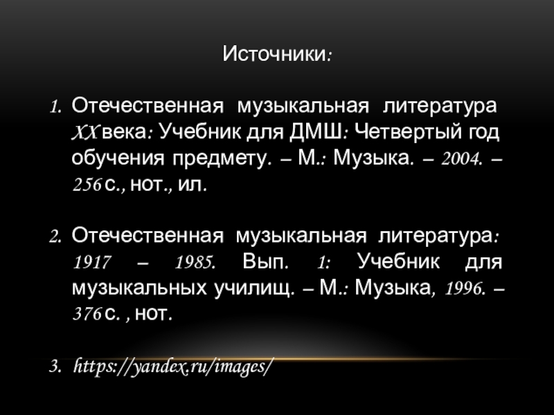Отечественная музыкальная литература: 1917 – 1985. Вып. 1: Учебник для музыкальных училищ. – М.: Музыка, 1996. – 376 с. , нот.