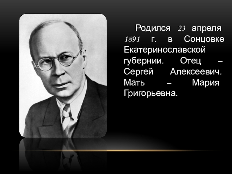 Слайд 2 Родился 23 апреля 1891 г. в Сонцовке Екатеринославской губернии. Отец –