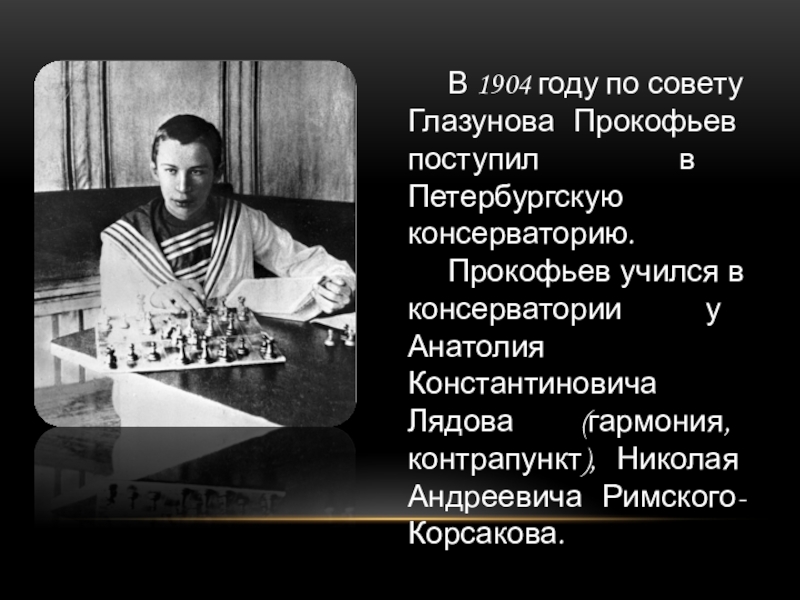 Слайд 5 В 1904 году по совету Глазунова Прокофьев поступил в Петербургскую консерваторию.