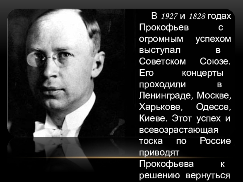 Советском Союзе. Его концерты проходили в Ленинграде, Москве, Харькове, Одессе, Киеве. Этот успех и всевозрастающая тоска по Россие приводят Прокофьева к решению вернуться на родину.