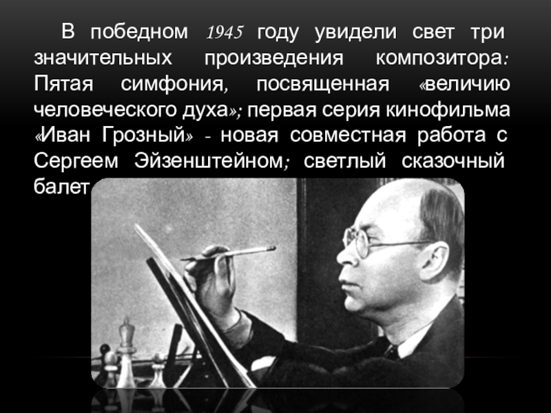 симфония, посвященная «величию человеческого духа»; первая серия кинофильма «Иван Грозный» - новая совместная работа с Сергеем Эйзенштейном; светлый сказочный балет «Золушка».