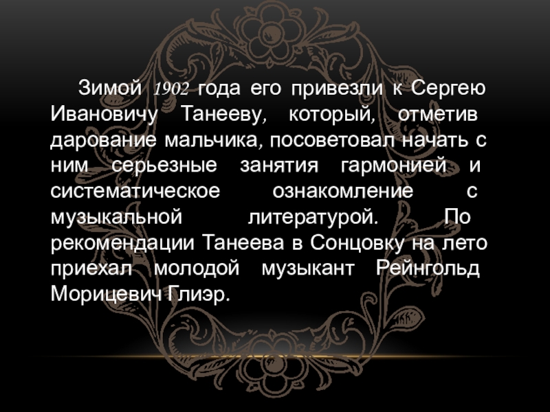 дарование мальчика, посоветовал начать с ним серьезные занятия гармонией и систематическое ознакомление с музыкальной литературой. По рекомендации Танеева в Сонцовку на лето приехал молодой музыкант Рейнгольд Морицевич Глиэр.