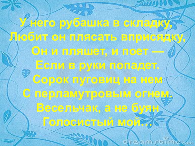 У него рубашка в складку, Любит он плясать вприсядку, Он и пляшет, и поет — Если в