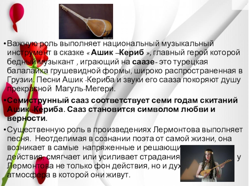 Важную роль выполняет национальный музыкальный инструмент в сказке « Ашик –Кериб