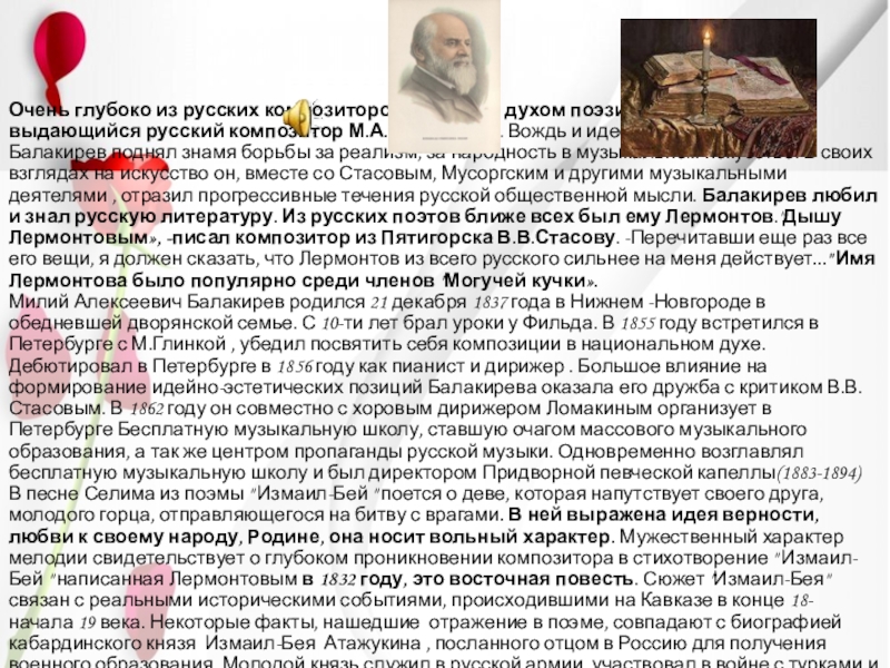композитор М.А. Балакирев. Вождь и идеолог " могучей кучки" Балакирев поднял знамя борьбы за реализм, за народность в музыкальном искусстве. В своих взглядах на искусство он, вместе со Стасовым, Мусоргским и другими музыкальными деятелями , отразил прогрессивные течения русской общественной мысли. Балакирев любил и знал русскую литературу. Из русских поэтов ближе всех был ему Лермонтов."Дышу Лермонтовым», -писал композитор из Пятигорска В.В.Стасову. -Перечитавши еще раз все его вещи, я должен сказать, что Лермонтов из всего русского сильнее на меня действует..." Имя Лермонтова было популярно среди членов "Могучей кучки».