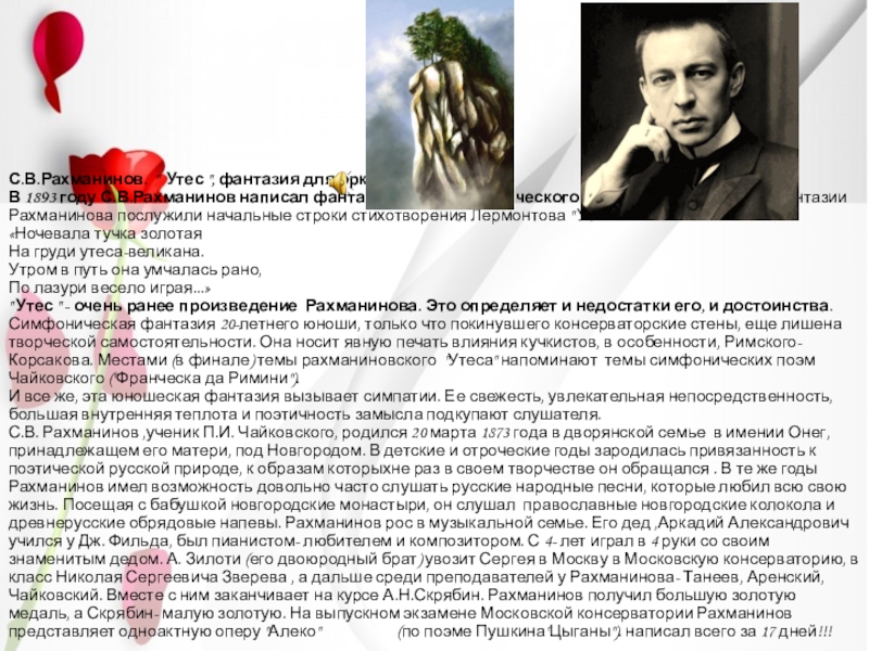 С.В. Рахманинов ,ученик П.И. Чайковского, родился 20 марта 1873 года в дворянской семье в имении Онег, принадлежащем его матери, под Новгородом. В детские и отроческие годы зародилась привязанность к поэтической русской природе, к образам которыхне раз в своем творчестве он обращался . В те же годы Рахманинов имел возможность довольно часто слушать русские народные песни, которые любил всю свою жизнь. Посещая с бабушкой новгородские монастыри, он слушал православные новгородские колокола и древнерусские обрядовые напевы. Рахманинов рос в музыкальной семье. Его дед ,Аркадий Александрович учился у Дж. Фильда, был пианистом- любителем и композитором. С 4- лет играл в 4 руки со своим знаменитым дедом. А. Зилоти (его двоюродный брат) увозит Сергея в Москву в Московскую консерваторию, в класс Николая Сергеевича Зверева , а дальше среди преподавателей у Рахманинова- Танеев, Аренский, Чайковский. Вместе с ним заканчивает на курсе А.Н.Скрябин. Рахманинов получил большую золотую медаль, а Скрябин- малую золотую. На выпускном экзамене Московской консерватории Рахманинов представляет одноактную оперу "Алеко" (по поэме Пушкина"Цыганы"). написал всего за 17 дней!!!