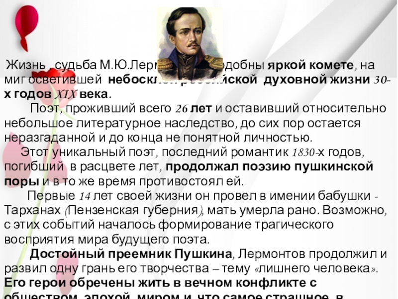 Этот уникальный поэт, последний романтик 1830-х годов, погибший в расцвете лет, продолжал поэзию пушкинской поры и в то же время противостоял ей.