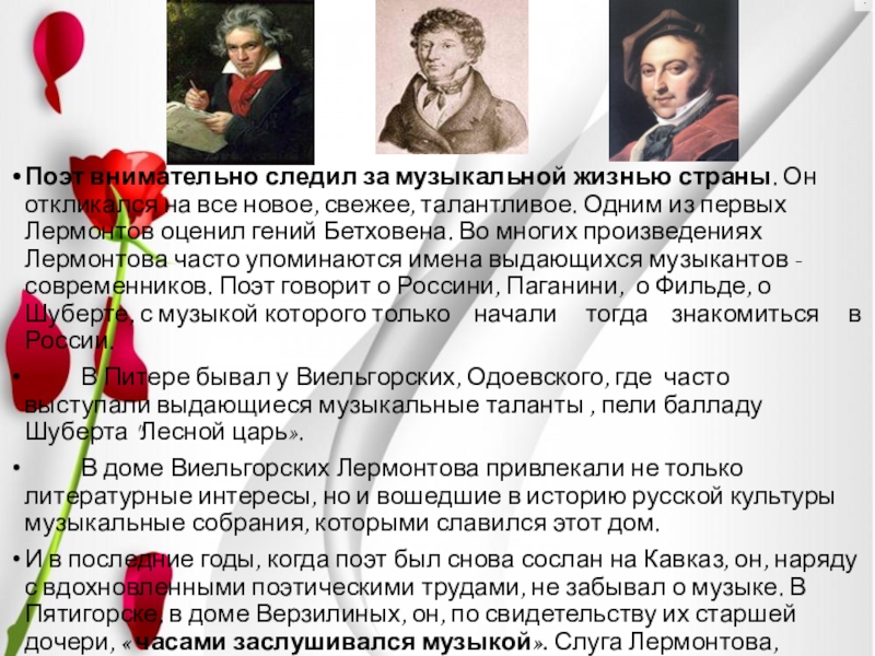 новое, свежее, талантливое. Одним из первых Лермонтов оценил гений Бетховена. Во многих произведениях Лермонтова часто упоминаются имена выдающихся музыкантов - современников. Поэт говорит о Россини, Паганини, о Фильде, о Шуберте, с музыкой которого только начали тогда знакомиться в России.